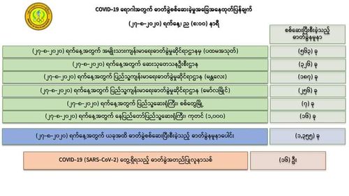 8月27日,仰光国家卫生化验室(NHL)对第一批563名人员的化验样本进行化验检查,医药科研所(DMR)对 326名人员的化验样本进行化验检查,曼德勒人民卫生化验室(PHL, Mandalay)对187名人员的化验样本进行化验检查,毛淡棉人民卫生化验室(PHL, Mawlamyine)对256名人员的化验样本进行化验检查,实兑市人民医院7名人员的化验样本进行化验检查,仰光第一军医1000床位医院对16名人员的化验样本进行化验检查,共1355人的化验样本中,发现有16人的样本中含有新冠病毒。
