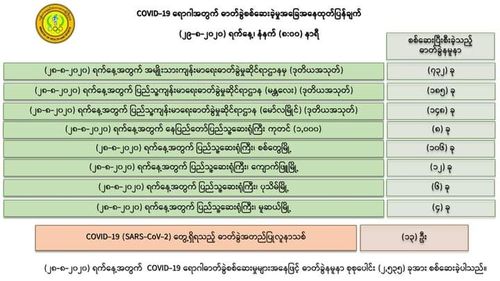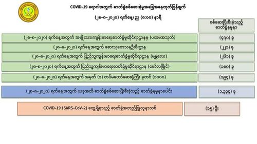 8月28日,仰光国家卫生化验室(NHL)对第一批470名人员的化验样本进行化验检查,医药科研所(DMR)对 221名人员的化验样本进行化验检查,曼德勒人民卫生化验室(PHL, Mandalay)对261名人员的化验样本进行化验检查,毛淡棉人民卫生化验室(PHL, Mawlamyine)对188名人员的化验样本进行化验检查,仰光第一军医1000床位医院对194名人员的化验样本进行化验检查,共1334人的化验样本中,发现有15人的样本中含有新冠病毒。