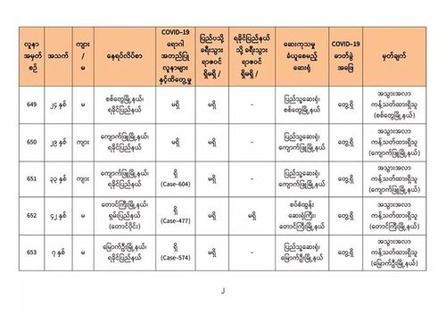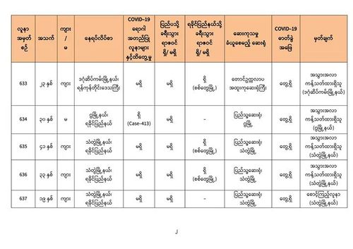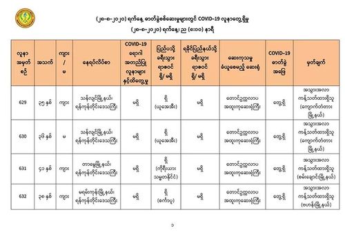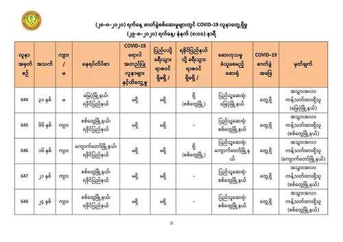 8月29日上午8时,卫生暨体育部再次发出公告,仰光国家卫生化验室对第二批732名人员的化验样本进行化验检查,曼德勒人民卫生化验室再对185名人员的化验样本进行化验检查,毛淡棉人民化验室再对148名人员的化验样本进行化验检查,内比都1000床位医院的8位人员的化验样本,实兑(Sittwe)人民医院的106位人员的化验样本,皎漂人民医院12名人员的化验样本,勃生(Pathein)人民医院的6名人员的化验样本,木姐人民医院4位的化验样本,共1201人的化验样本中,发现有13人的样本中含有新冠病毒。