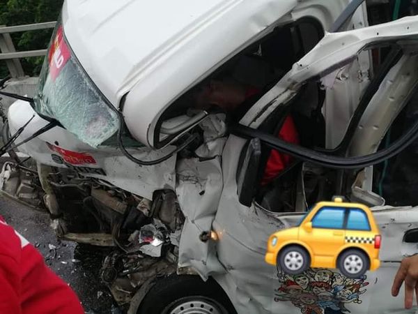 据一位目击者称,一辆Hijet小型货车与一辆雪佛兰轿车迎面相撞,小货车上的3位男子的腰部及脚受伤,其中一位伤势严重。
