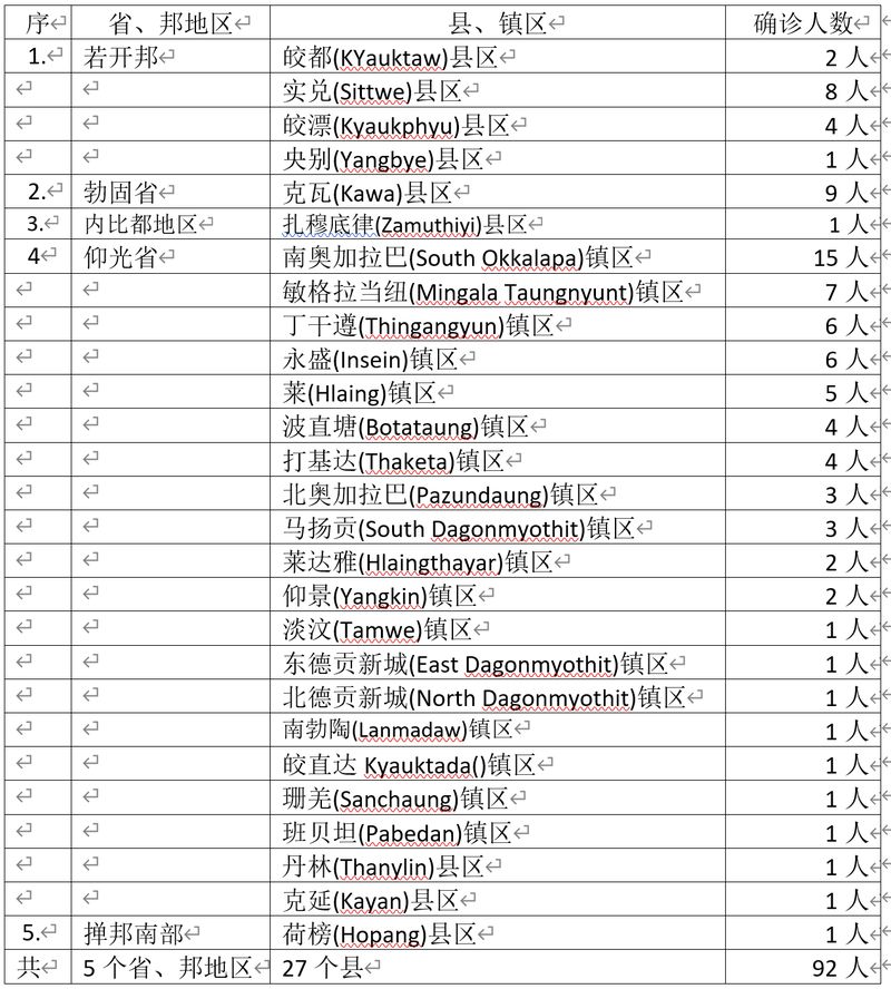 92名确诊者来自5个省邦地区,27个县,其中以仰光省20个县镇区66人为最多。若开邦4个县15名确诊者,内比都与掸邦南部各1县各1人,勃固省虽也是1县但确诊者却高达9人。该勃固省的克瓦县在6日这一天也发现高达8人的确诊者,现在又发现9人,确诊人数不可谓不多了。