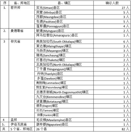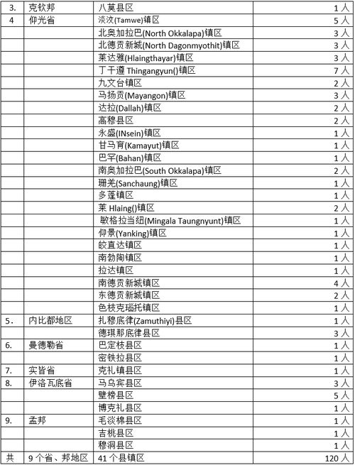 总计9月9 日1天之内发现202名确诊者,又创24小时内发现确诊者的新纪录。而且这一天原来以为疫情况已转缓和的若开邦情况最为严重:1天之内7个县区的确诊者人数达到90人,特别是首府实兑1县区确诊人数达到58人,令人震惊。其他省邦地区的确诊人数,仰光情况还是不乐观:29个县镇区确诊人数为81人。伊洛瓦底省4个县区确诊人数10人,孟邦3个县区确诊人数7人,曼德勒4个县区5位确诊者,内比都2县区4名确诊者,马奎省2个县区3名确诊者,算是“中度”感染地区。而实皆省及克钦邦各1县区各1名确诊者,就属于“小儿科”了。