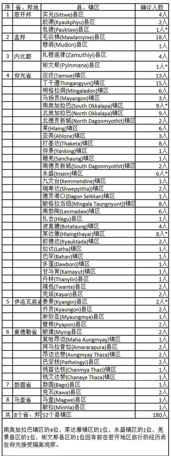 缅甸卫生暨体育部9月12日中午12时发出公告,公布了9月11日所发现的180名确诊者的个人资料。