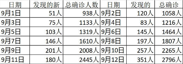 在9月10日这一天新发现的确诊人数达到257人的高峰,之后11日这一天人数回降到180人,人们以为第二波疫情已越过最高峰,新发现的确诊人数应有所回降了,却没想到,9月12日这一天又创下单日发现新确诊人数的新纪录351人,疫情蔓延的情况真的是“不以人们的意志为转移”了。