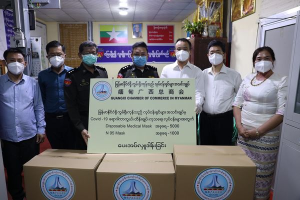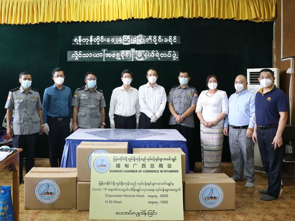 9月10日,缅甸广西商会分别向仰光省莱达雅镇政府、镇移民局、镇警察局捐赠防疫物资。中国驻缅甸使馆经商参赞谭书富,莱达雅镇东区副区长刚梭莱、吞乃温,东区移民局局长钦貌吞等参加。