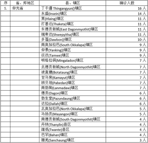 284名确诊者中,仰光省34个县镇区感染212人,占总人数的75%,仰光省疫情蔓延情况显然还没有减缓的现象。确诊人数最多的镇区还是丁干遵镇区,在连续多次确诊人数遥遥领先各县区之后,这一次还是以16人的“成绩”领先各县区。与之相比其他省邦的确诊人数是微不足道了。不过内比都1个县区居然有8人感染,不能不令人震惊,有人猜测是有国防军高层人士已受到疫情感染,因为在内比都的第二军医1000床位医院已参与了病毒检测工作。而若开邦2个县区有45位确诊者,实兑地区再次发现44位确诊者,人们可以感受到这地区疫情的反复回弹局势。孟邦只有毛淡棉1个县区榜上有名,但却有5名确诊者,不能不引人注目。其余曼德勒省4个县区4名确诊者,勃固省2个县区2名确诊者,伊洛瓦底省2个县区3名确诊者,实皆省2个县区3名确诊者,德林达依1个县区2名确诊者,人数都不算多,但这几个省都已有不少确诊者了,不能因为现在新发现的确诊人数少而放松警惕性。而且有的县区(例如实皆省的布达林县区、伊洛瓦底省的德努彪县区)现在才发现新冠病患,也是应多加注意的一件事:这些病患是从何处来的?如何受到病毒感染?这些都应多加探讨,尽可能找出病毒源头才行。