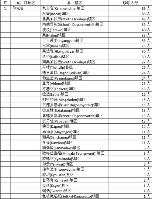 869名确诊者中,仰光省38个县镇区感染783人,占总人数的90%,仰光省疫情蔓延情况多么严峻由此可见。这当中确诊人数最高的却又变成九文台镇区及永盛镇区,感染人数高达89及88人,令人咋舌。其他省邦方面,若开邦3县21名确诊者,曼的勒省5县15人,勃固省3县15人,孟邦5县16人,都是不可忽视的疫情较为严重的地区。实皆省及伊洛瓦底省都是5县7人,但联系前几天的确诊者人数来看,显然伊洛瓦底省的疫情会更严重。最后克伦邦2县2人,克钦邦2县2人,马奎省1县1人,看似问题不大,但也要小心其是否会产生“星火燎原”的效应。
