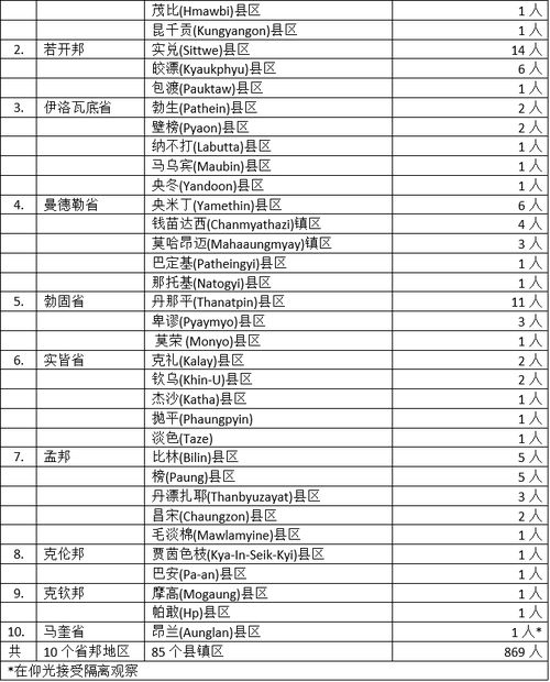 缅甸卫生暨体育部9月24日下午6时30分发出公告,通告9月23日发现的869名确诊者的一些情况。这869名确诊者来自10个省邦地区,他们所属县镇如下: