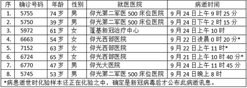 24日晚上8时的公告及25日早上8时的公告中说共有8名确诊者逝世,至此,缅甸国内因新冠疫情而病逝的人数已达到155人。