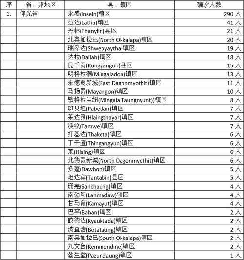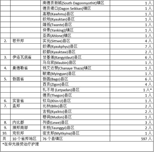 597名确诊者中,仰光省36个县镇区感染551人,占总人数的92%,仰光省疫情蔓延情况到今天还是全国之冠,永盛1镇区居然有290名确诊者,据社交媒体上之说是一寺庙的僧侣全体受感染所致。其他省邦方面,若开邦3县13名确诊者,伊洛瓦底省2县7名确诊者,勃固省4县12人,孟邦3县5人,内比都1县3名确诊者,这几个省邦本来都是不可忽视的疫情较为严重的地区,现在感染人数减少了,固然值得欣喜,但就怕疫情又出现反复,故还是不可大意。剩下的省邦地区,曼德勒2县区2名确诊者,实皆省及克钦邦都是1个县区1名确诊者,掸邦南部1县区2名确诊者,确诊人数似乎都是“屈指可数”,但曼德勒省原来每天都有确诊者出现,现在确诊人数都相当的数量了,如今确诊人数有所减少,还是不能马虎大意,要谨防“死灰复燃”现象出现。