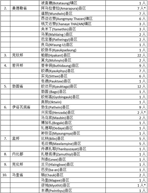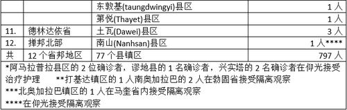 797名确诊者中,仰光省37个县镇区感染661人,占总人数的83%,确诊人数还是全国之冠。但是全国其他省邦地区的确诊人数也是在增加之中。其中曼德勒省9县32名确诊者,克钦邦2县24名确诊者,若开邦4县23名确诊者,勃固省4县15名确诊者,伊洛瓦底省6县16名确诊者,孟邦3县11名确诊者,都说明这几个省邦地区疫情蔓延情况还很严峻。这当中有人说若开邦疫情蔓延情况已不似过去一段时间那么严重,防疫工作有一定成效了;但菩帝洞这个原来感染不算严重的县区,现在一举发现9名新确诊者,情况不容乐观。而克钦邦内帕敢县区一举发现22名确诊者,已使该县区成为克钦邦疫情确诊者最多的县区,应该对其实施更严格的防疫措施了(颁布禁足令或宣布封城)。而勃固省皎德开县12名确诊者,伊洛瓦底省首府勃生市再发现9名确诊者,都说明这些地区疫情蔓延情况不容忽视。至于剩下的省邦地区,德林达依省1县3名确诊者,而且还是首府土瓦县区,以前这里也发现过疫情确诊者,现在连续几天发现确诊病患,也说明此地疫情蔓延还有一定的趋势。马奎省6县7人,平均每县1人,虽说情况不算严重,但很多县区属于初次感染现象,也不是一件好事。克伦邦与内比都地区都是2县区2名确诊者,但都是以前就有确诊者感染的地区,只有掸北的南山县区(有名德昂民族的茶叶之乡)算是第一次发现确诊者了。