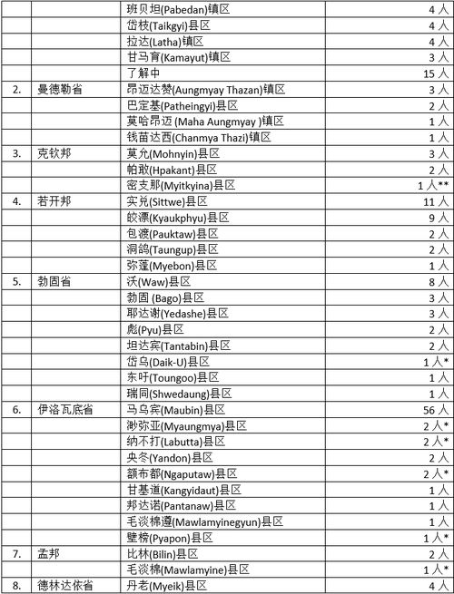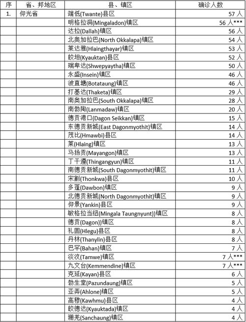 946名确诊者中,仰光省40个县镇区感染786人,占总人数的83%,确诊人数还是全国之冠。特别是作为农业县的端低县57名确诊者,皎坦县52名确诊者,令人震惊。而且全国其他省邦地区的确诊人数也是在增加之中。其中伊洛瓦底省9县68名确诊者,其中马乌宾1县区就有56名确诊者,几乎是一跃而成为该省的疫情人数最多的县区,这种情势的巨变更加令人担忧。相比之下,若开邦5县25名确诊者,勃固省8县21名确诊者就显得不那么严重了。实皆省4县19人,其中有2县区各7名确诊者,而且还可能是第一次出现这么多确诊者,这蔓延情况不可不重视。其他省邦地区曼德勒省4县7人,克钦邦3县6人,孟邦2县3人,德林达依2县5人,蔓延程度各有轻重不同,但都不能等闲视之。剩下的克伦邦、内比都、掸北地区各为1县1名确诊者,没什么好说的,掸南地区3县区3名确诊者,也属于1县1名确诊者,这些就像是“星星之火”,要谨防其发展成为燎原之势。