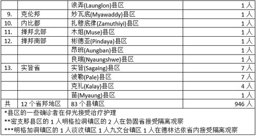 缅甸卫生暨体育部10月1日下午5时30分发出公告,通告9月30日这一天发现的946名确诊者的一些情况。这946名确诊者来自12个省邦地区(公告中掸邦被分成南、北两部,所以变成13个省邦地区),他们所属县镇如下: