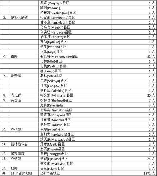 缅甸卫生暨体育部10月20日下午6时发出公告,通告10月19日这一天发现的1171名确诊者的一些情况。这1171名确诊者来自14个省邦地区,他们所属的县镇地区如下: