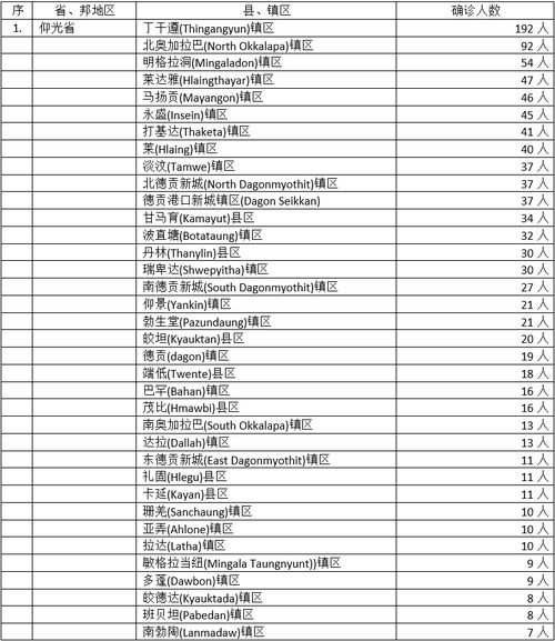 1466名确诊者中,仰光省41个县镇区感染1092人,占总人数的74%,确诊人数比例照样是居于全缅之冠,确诊人数的县镇区总数到达41个县区,而且位居第一的丁干遵镇区确诊人数到达192人,比位居第二的北奥加拉巴(92人)整整多出100人,可见该镇区疫情蔓延的严重性。