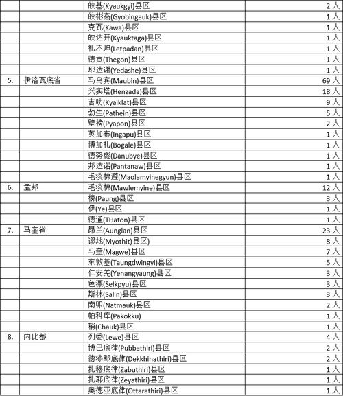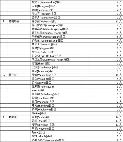 全国各省邦的蔓延情况,勃固省第一的地位为伊洛瓦底省10县区108名确诊者的记录所取代,而且马乌宾单日确诊人数达到69人,显现出该地区疫情的严重性。勃固省与曼德勒省的感染县区都是14县,但勃固省确诊人数达到64人,曼德勒省为49人,两省的疫情蔓延情况仍旧不能乐观。而马奎省10县区56名确诊者,说明该省的疫情蔓延情况同样十分严重。相对比较起来,若开邦11县区35名确诊者,情况是比较和缓一些了,但这只是“相对”而论,其实若开邦的疫情不断出现反复,直到今天还未见有和缓的迹象。而德林达依省区2县23名确诊者,也透析出该省的疫情蔓延的严重性,特别是丹老(16名确诊者)及土瓦(7名确诊者)是该省的两大重镇,疫情感染情况不能掉以轻心。其余省邦地区,孟邦4县区17名确诊者,内比都6县11名确诊者,说明此2 地区疫情情况还不稳定,说不定有“死灰复燃”的可能性。剩下的省邦,实皆省2县5名确诊者,克伦邦1县2名确诊者,掸邦3县区3名确诊者,克耶邦1县1名确诊者,看似确诊人数不多,但也还是不能放松警惕性,原来“零确诊”的克耶邦现在已是第4名确诊病患了,有人担心会继续蔓延,说不定在一个早晨其的蔓延人数就会突然暴增到一个令人吃惊的数据呢。
