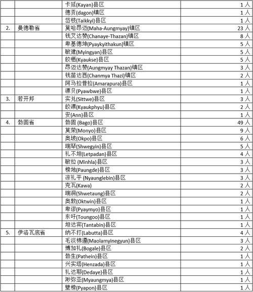 全国各省邦的蔓延情况,勃固省14县区90名确诊者,不论在感染县区数或是确诊总人数方面都在各省邦中位居第一,恢复了多日第一的榜首。而首府勃固确诊者49名,显见该县的疫情的蔓延情况还十分严重。而接下来的曼德勒省9县53名确诊者,其中5个闹市区(Downtown)都还是“榜上有名”,莫哈昂迈以23名确诊者位居全省第一。其余省邦中,伊洛瓦底省8县14名确诊者,实皆省及若开邦皆为3县区6名确诊者,特别是若开邦,疫情似乎比较缓和了。剩下来的省邦中,马奎省3县区3名确诊者,克伦邦2县区2名确诊者,掸邦1县区1名确诊者,情况都似乎不严重了,但在直粦卒节日过后,大选如火如荼开展之时,是否又会出现新的疫情风潮,也是令人担忧的。
