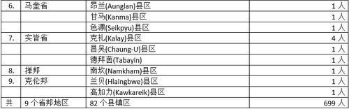缅甸卫生暨体育部11月2日下午5:30时发出公告,通告11月1日这一天发现的699名确诊者的一些情况。这699名确诊者来自9个省邦地区,他们所属的县镇地区如下: