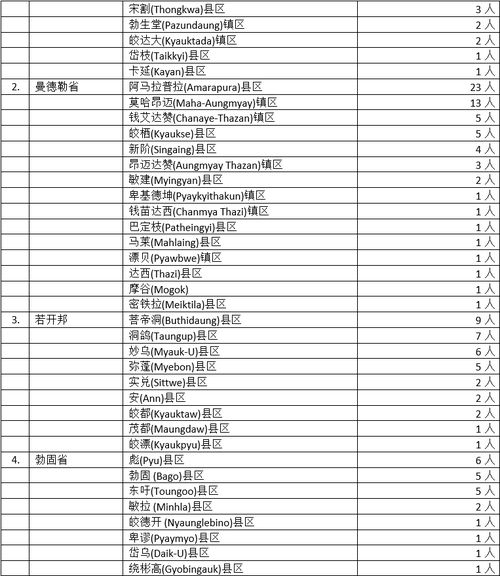 全国各省邦的蔓延情况,曼德勒省15县区63名确诊者,不论是感染县区数或确诊人数都位居各省邦第一,而5个闹市区持续榜上有名,曼德勒省的疫情蔓延情况由此可见一斑。接下来的伊洛瓦底省、若开邦、勃固省都各有9个县区受感染,但确诊人数各不同:伊洛瓦底省44人,若开邦35人,勃固省23人,恰好形象地表露出了疫情蔓延情况多寡不同的现象。这3省邦中以伊洛瓦底省首府勃生确诊人数为最多(18人),其余县区确诊人数都在10人以下。接下来的实兑省5县区14名确诊者,孟邦4县区13名确诊者,疫情蔓延情况有所缓和。剩下的省邦地区,马奎省6县区7名确诊者,掸邦4县区5名确诊者,克伦邦1县区3名确诊者,德林达依省1县区2名确诊者,比较起来反而是克伦邦妙瓦底1县3名确诊者情况较严重,因为之前该县区已一再发现多名确诊者(11月3日就发现7名确诊者),现在“积少成多”,确诊人数应是到达相当多的人数了。