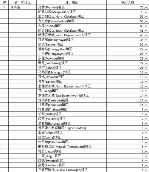995名确诊者中,仰光省确诊人数为786人,占总人数的79%,确诊人数比例照样是居于全缅之冠,确诊人数的县镇区总数到达41个县区,确诊人数最多的县镇区为丹林县区(73人),目前丹林县区是仰光市周边11个农业县中疫情蔓延最严重的县区了。