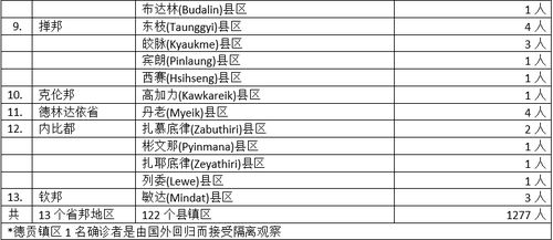 全国各省邦的蔓延情况,曼德勒省16县镇区确诊人数120人,确诊人数位居各省邦的榜首之位,其中5个闹市区持续“榜上有名”,而这当中莫哈昂迈镇区确诊人数达到35名,位居全省榜首,可见疫情蔓延情况仍是十分严峻。紧随其后的勃固12县区85名确诊者,马奎省18县区确诊人数75人,伊洛瓦底省14县区58名确诊者,都说明这3个省区疫情蔓延情况严重,而且有多个县区确诊人数在10名以上,且多日连续“榜上有名”,疫情情况严重不言而喻。接下来的若开邦7县区29名确诊者,孟邦2县区10名确诊者,掸邦4县区9名确诊者,实皆省2县区6名确诊者,疫情还不敢说平稳,而且有的县区确诊人数还可能出现反复,这是不能不多加注意的。最后剩下的省邦地区,内比都4县区5名确诊者,德林达依1县区4名确诊者,钦邦1县区3名确诊者,克伦邦1县区1名确诊者,就一个省区来说,确诊人数不算多,但德林达依省丹老1县区就出现4名确诊者,还是不能掉以轻心,特别是13日一天该丹老县区单日就出现10名确诊者,说明该县区疫情还是很严重的。缅甸全国各省邦的疫情,目前都是扑朔迷离,离最后和缓的局面可能还有一段不短的路程呢。