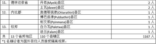 缅甸卫生暨体育部11月17日下午4时发出公告,通告11月16日这一天发现的1167名确诊者的一些情况。这1167名确诊者来自13个省邦地区,他们所属的县镇地区如下: