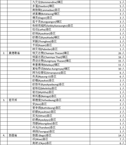 全国各省邦的蔓延情况,曼德勒省12县镇区确诊人数96人,确诊人数位居各省邦的榜首之位,其中5个闹市区不仅“榜上有名”,而且都还是“名列前茅”,位于全省的前5名,总计这5闹市区确诊人数达到68名,占全省的总人数的71%,足见曼德勒大都市疫情蔓延的严重性。接下来的各省邦中,伊洛瓦底省13县区62名确诊者,孟邦4县49名确诊者,勃固省9县35名确诊者,克伦邦3县25名确诊者,实皆省5县20名确诊者,都有说明这些省邦疫情情况不容乐观,有多个县区单日确诊人数都达到10人以上,孟邦前几天疫情似乎稳定,但16日一天就有两县区吉桃及德通确诊人数分别达到25人及20人,就可见疫情的严重性。而若开邦的9县区16名确诊者,马奎省的4县区12名确诊者,每县区最多只有4名确诊者,属于“小猫三四只”的情景,但也不能掉以轻心,作为第二波疫情的始发地若开邦,疫情蔓延情况就已一再出现反复的现象。剩下的德林达依省2县4名确诊者,掸邦2县区4名确诊者,内比都2县区2名确诊者,钦邦2县区2名确诊者,更是属于“星星之火”,有的还属于“残余火种”,是否能将其完全扑灭,或是会出现“死灰复燃”现象,都是令人十分担忧的。