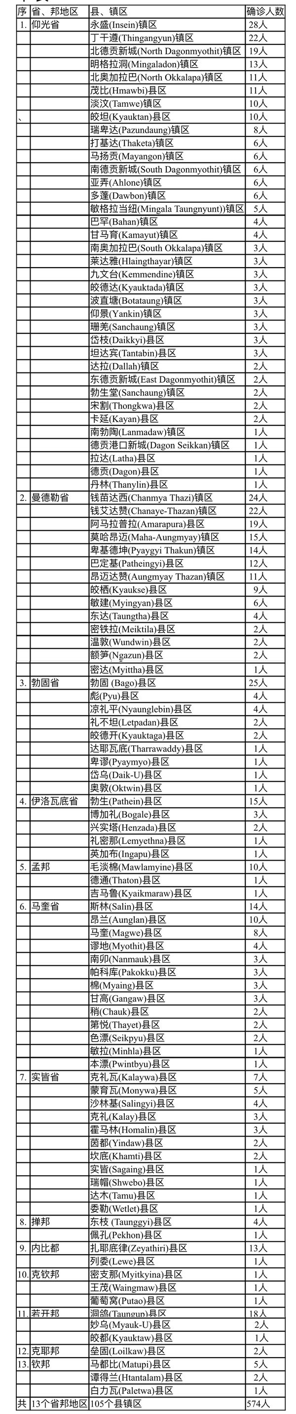 574名确诊者中,仰光省确诊人数217人,占总人数的38%,确诊人数比例及确诊人数总数都仍居全国第一位。确诊的县镇区总数为36个县镇区。确诊人数最多的县镇区为永盛镇区(28人)及丁干遵镇区(22人),其余县镇区确诊人数都少于20人,有28个县镇区的确诊人数在9人以下。各县镇的确诊人数都有相当程度的下降,而且这也是连续9天全省确诊人数在300人以下,也是自10月1日以来三个月内单日确诊者第二少的记录(最低记录就是1月1日的138人的记录)。只是是否能维持继续下降的趋势,还有待观察。