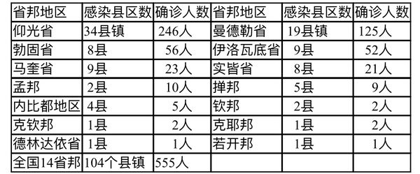 总计555名确诊者来自14个省邦地区的104个县镇区。