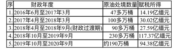 由2016—17财政年度开始至2019—20财政年度,由马奎省内往省外共运出原油6,662,410桶。自2016年6月2日开始,每桶原油50加仑的税赋定为3000缅元,2018年10月1日开始这税赋改为每桶原油5000缅元,马奎省资源环保电力暨能源部部长U Myint Zaw这样介绍赋税征收情况。