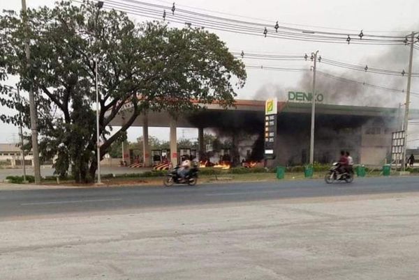 3月23日下午6时左右,位于曼德勒市勃生基镇(Patheingyi)楠吴伦小(Nan Oo Lwin)第26条街与环城路角处的Denko加油站遭到10多人的袭击。肇事者向加油站投掷自制汽油弹,并用刀具破坏店面,玻璃窗,收银台和加油机等。