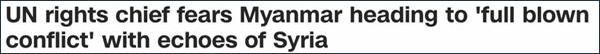 据CNN报道,上周二(13日),联合国人权事务高级专员米歇尔·巴切莱特(Michelle Bachelet)曾警告称,当前缅甸的局势与2011年的叙利亚有明显的相似之处,除非国际社会介入制止暴力,否则缅甸将走向2011年叙利亚的“全面冲突”。