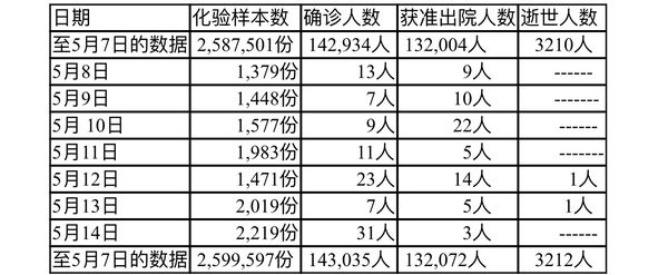 缅甸卫生暨体育部每天晚上8时都按时发出公告,介绍国内疫情发展的最新情况。由5月8日至5月14日每晚8时时所公布的情况分别如下: