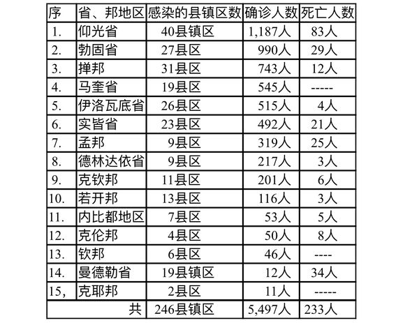 缅甸卫生暨体育部7月18日下午5时时,再公布全国各省邦7月17日的确诊人数及死亡人数,具体数据如下表: