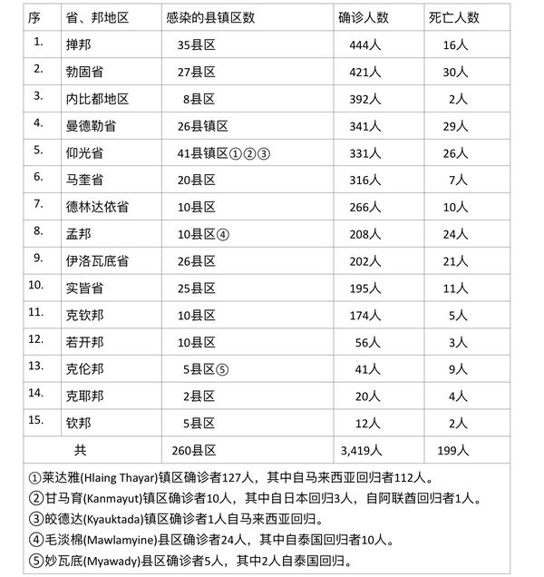 据缅甸卫生部8月14日下午5时所发布的公告,全国各省邦8月13日的确诊人数共为3456人,死亡人数212人,具体数据如下表: