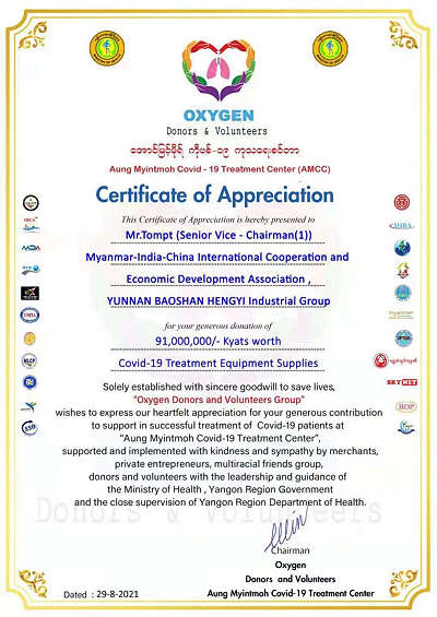 在这个缅甸历史的危难关头,一家名为“氧气捐助者和志愿者组织”的公益机构,联合了热心于公益事业的一批人士,在缅甸各业界和社会组织的支持下,在仰光省德贡港口镇南部144小区罗咖路和昂敏莫路拐角处,于2021年7月20日启动了“昂敏莫新冠肺炎治疗中心”,至8月28日为止,该中心共接收治疗了613名病人,痊愈出院的有499名,死亡人数13人,目前还有101位病人。