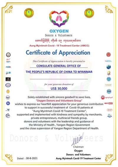 “氧气捐助者和志愿者组织”(Oxygen donors and volunteers group)受到缅甸各业界和社会广泛支持,发起建立了昂敏莫新冠肺炎治疗中心Aung Myintmoh COVID-19 Treatment Center (AMCC)。