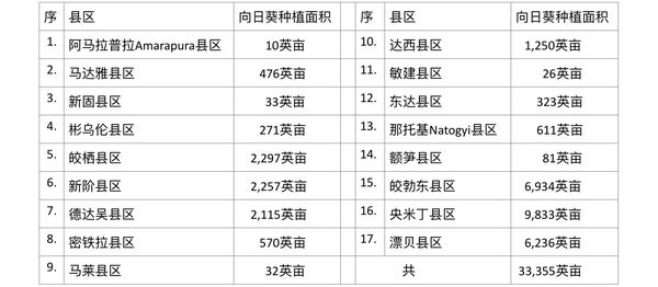 该雨季作物向日葵在7个专区的17个县区内完成的种植情况如下表:
