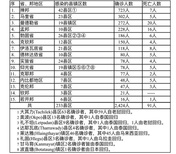 据缅甸卫生部9月16日下午4时所发布的公告,全国各省邦9月15日的确诊人数共为2424人,死亡人数91人,具体数据如下表: