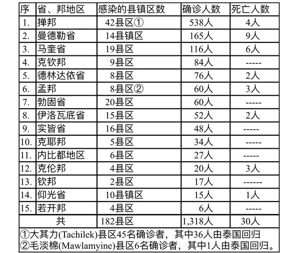 缅甸卫生部于10月11日下午4时发布的公告,全国各省邦10月10日的确诊人数共为1318人,死亡人数30人,具体数据如下表: