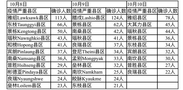 而且疫情蔓延不是只集中在一两个地区或县区,掸邦分为掸北、掸南及掸东这三个行政区,这三个行政区都有众多的的县区是这一波疫情的“重灾区”。仅以最近3天(10月8日、9日及10日)为例,这3天就有众多县区的确诊人数到达三四十人以上,而且还有确诊人数超过百人的“超级重灾区”呢.