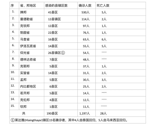 死亡人数方面,马奎省为第一(6人),掸邦与伊洛瓦底省蝉联第二(皆为5人),其他省邦地区死亡人数都是“屈指可数”了,仰光省、德林达依省、克伦邦、若开邦与钦邦为零死亡地区,其中,钦邦连续4天为零死亡地区,若开邦连续3天为零死亡地区。