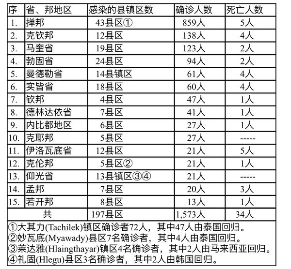 缅甸卫生部于10月14日下午4时发布的公告,全国各省邦10月13日的确诊人数共为1573人,死亡人数34人,具体数据如下表: