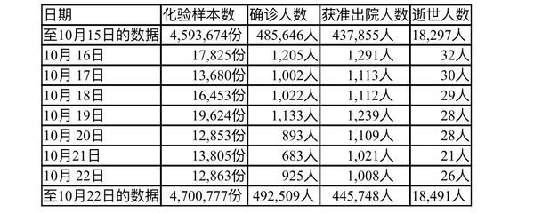 10月22日全国各地的化验室检测到的病患确诊者人数如下: