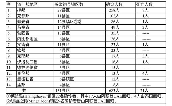 缅甸卫生部于10月22日下午4时发布的公告,全国各省邦10月21日的确诊人数共为683人,死亡人数21人,具体数据如下表: