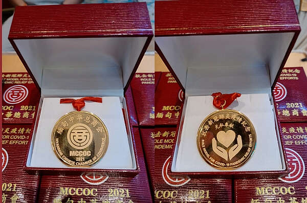 接着林文猛会长和其他负责人向医务人员、志愿者、社团、企业、单位、个人等颁发金质纪念章。