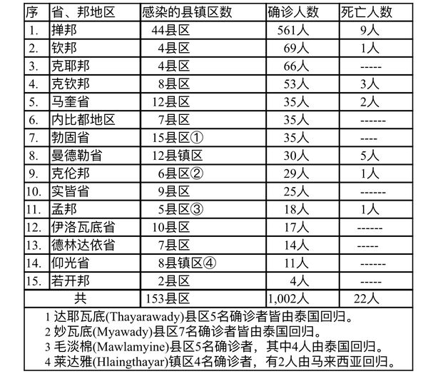 缅甸卫生部于11月5日下午4时发布的公告,全国各省邦11月4日的确诊人数共为1002人,死亡人数22人,具体数据如下表: