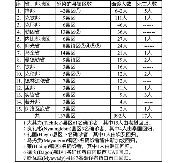 缅甸卫生部再于11月13日下午6时发布公告,全国各省邦11月12日的确诊人数共为992人,死亡人数17人,具体数据如下表: