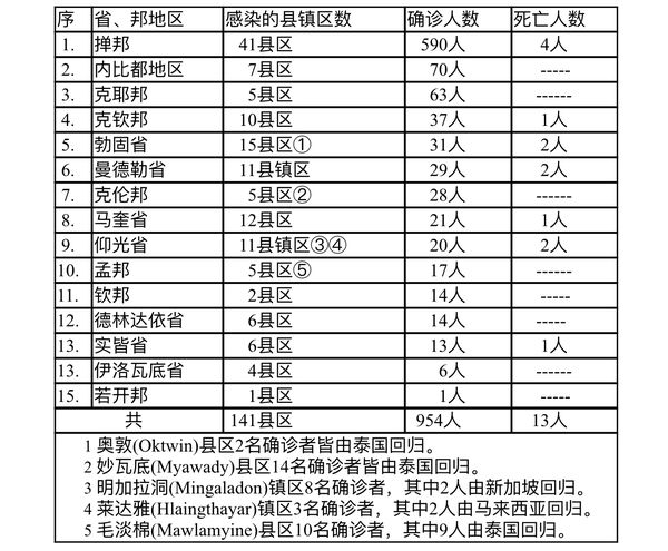 缅甸卫生部于11月12日下午4时发布的公告,全国各省邦11月11日的确诊人数共为954人,死亡人数13人,具体数据如下表: