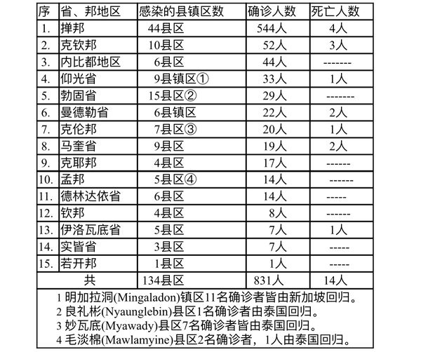 缅甸卫生部再于11月14日下午4时发布公告,全国各省邦11月13日的确诊人数共为831人,死亡人数14人,具体数据如下表: